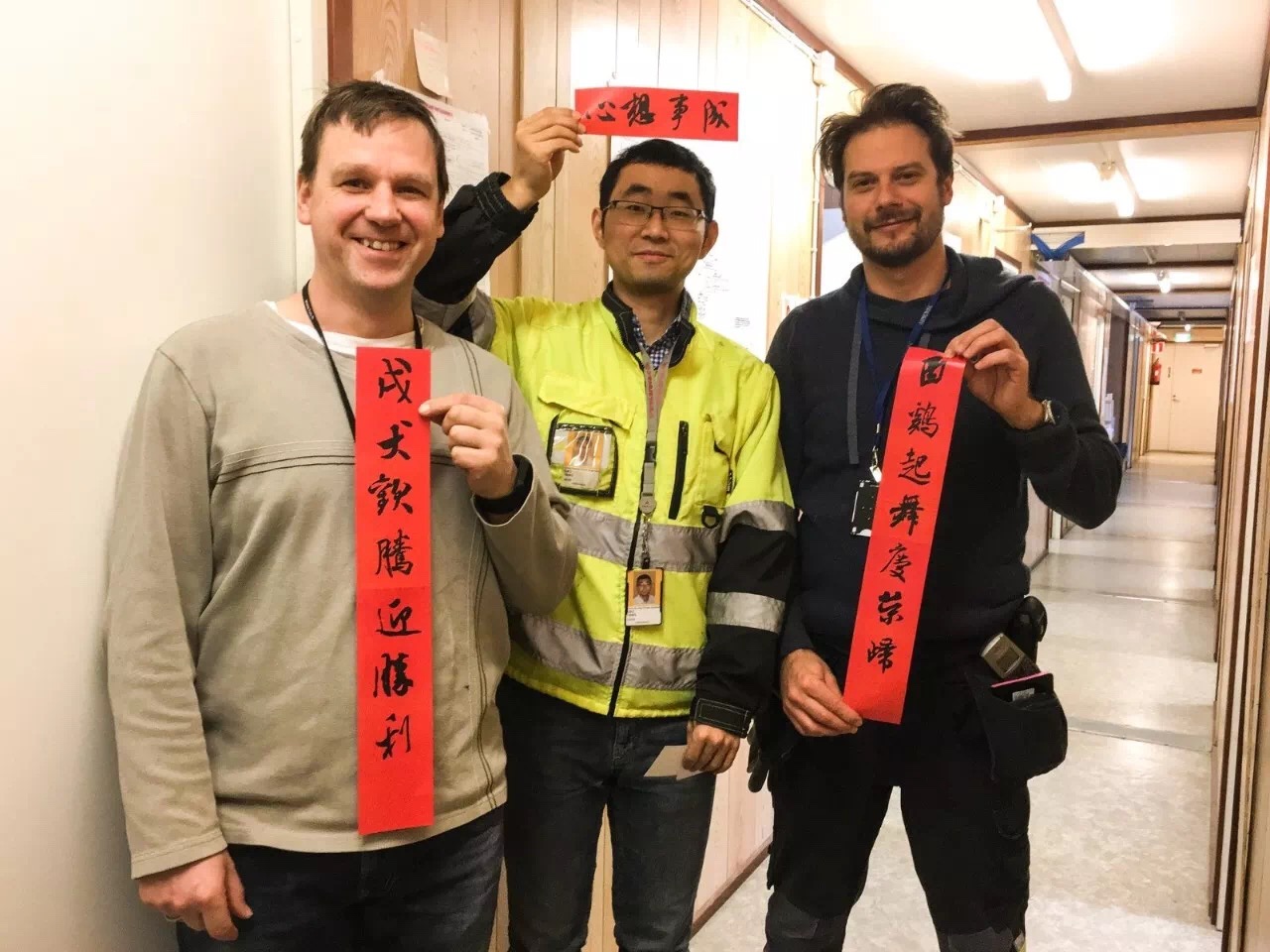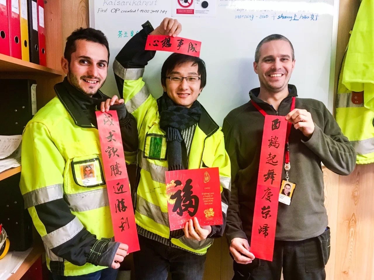 除夕當天,他們?yōu)橥瑯訆^戰(zhàn)在芬蘭核電現場的國際同仁送去來自中國春節(jié)的祝福。自制的福字與春聯為2018的芬蘭項目增添了一份喜慶,一聲祝福,一抹中國紅,老外對上面的書法與內容頗感興趣,但感嘆漢字太過復雜表示完全看不懂,不過他們高興的接受了這份best wishes。每個人臉上掛著笑容互相道聲:“Happy Chinese New Year?!?/span>
