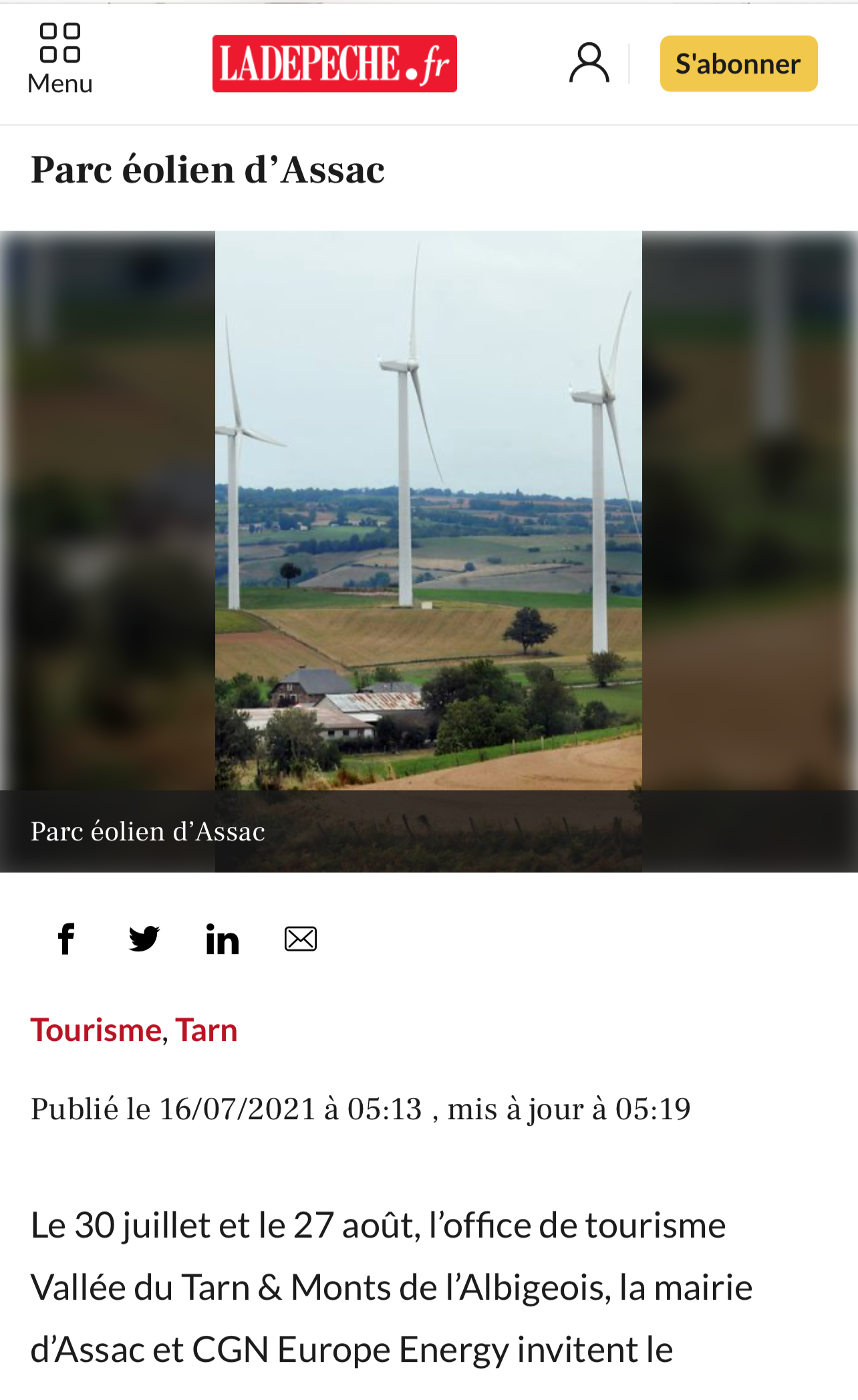 法國西南部地區(qū)性日報《快報》(La Dépêche)報道中廣核歐能公司聯(lián)合塔恩河谷和阿爾比蓋奧山旅游局和Assac市政府將在今年夏天開展的“探索風(fēng)電場”為主題的公益性參觀活動。該報讀者人數(shù)73萬。