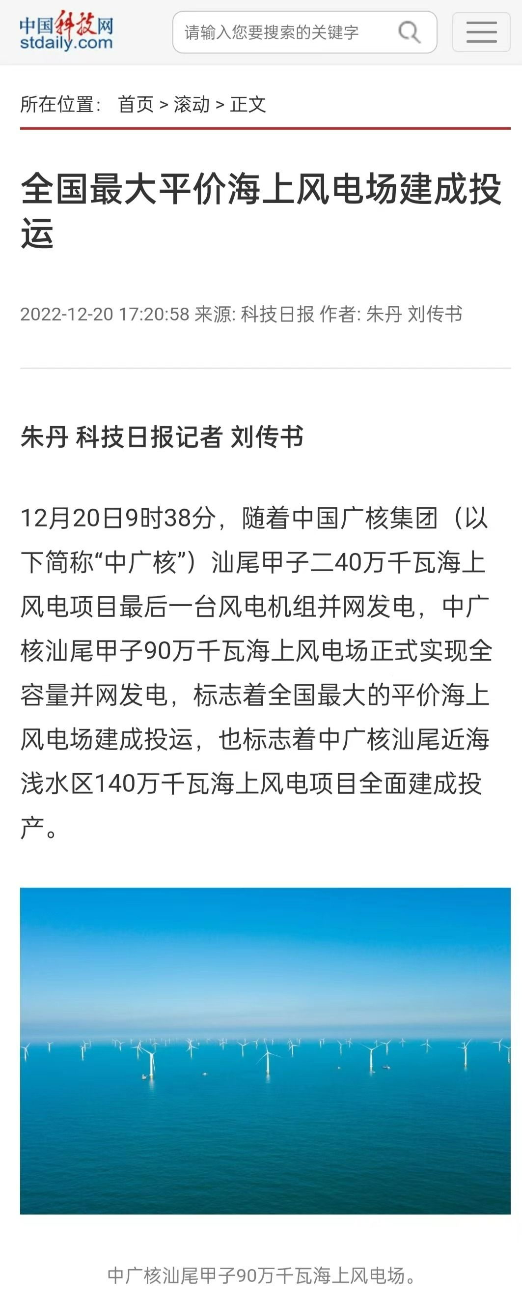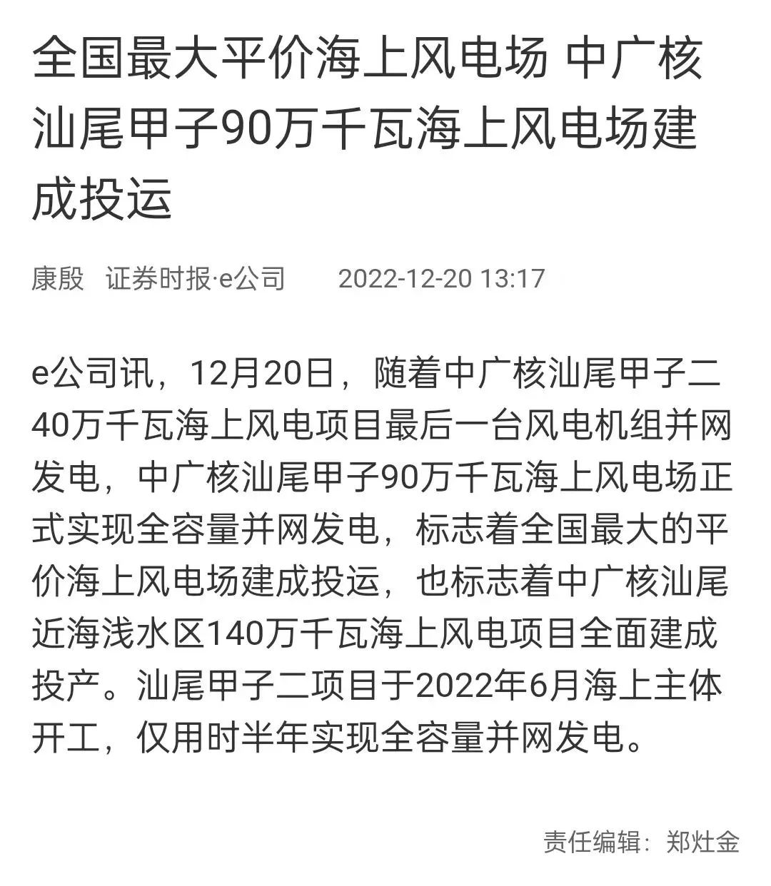 12月20日9時(shí)38分,隨著中國(guó)廣核集團(tuán)(簡(jiǎn)稱(chēng)“中廣核”)汕尾甲子二40萬(wàn)千瓦海上風(fēng)電項(xiàng)目最后一臺(tái)風(fēng)電機(jī)組并網(wǎng)發(fā)電,中廣核汕尾甲子90萬(wàn)千瓦海上風(fēng)電場(chǎng)正式實(shí)現(xiàn)全容量并網(wǎng)發(fā)電,標(biāo)志著全國(guó)最大的平價(jià)海上風(fēng)電場(chǎng)建成投運(yùn),也標(biāo)志著中廣核汕尾近海淺水區(qū)140萬(wàn)千瓦海上風(fēng)電項(xiàng)目全面建成投產(chǎn)。