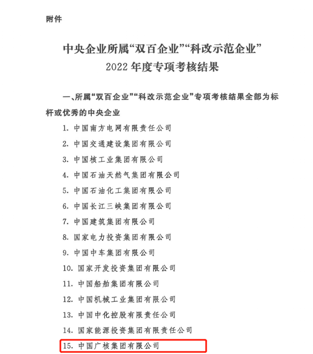 近日,國務(wù)院國有資產(chǎn)監(jiān)督管理委員會組織對中央企業(yè)所屬“雙百企業(yè)”“科改示范企業(yè)”2022年度改革創(chuàng)新情況進行專項考核,并正式印發(fā)《中央企業(yè)所屬“雙百企業(yè)”“科改示范企業(yè)”2022年度專項考核結(jié)果》,中國廣核集團旗下8家試點企業(yè)獲評“3標桿”“5優(yōu)秀”的良好成績,專項考核綜合排名位居央企第15位。