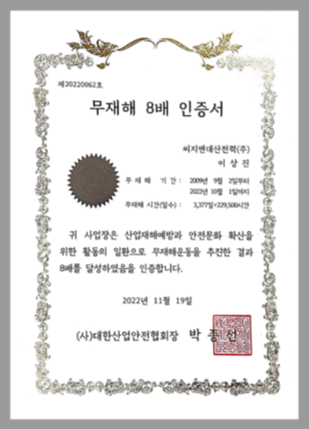 ▲大韓產業(yè)安全協(xié)會為大山電廠頒發(fā)的無事故證書