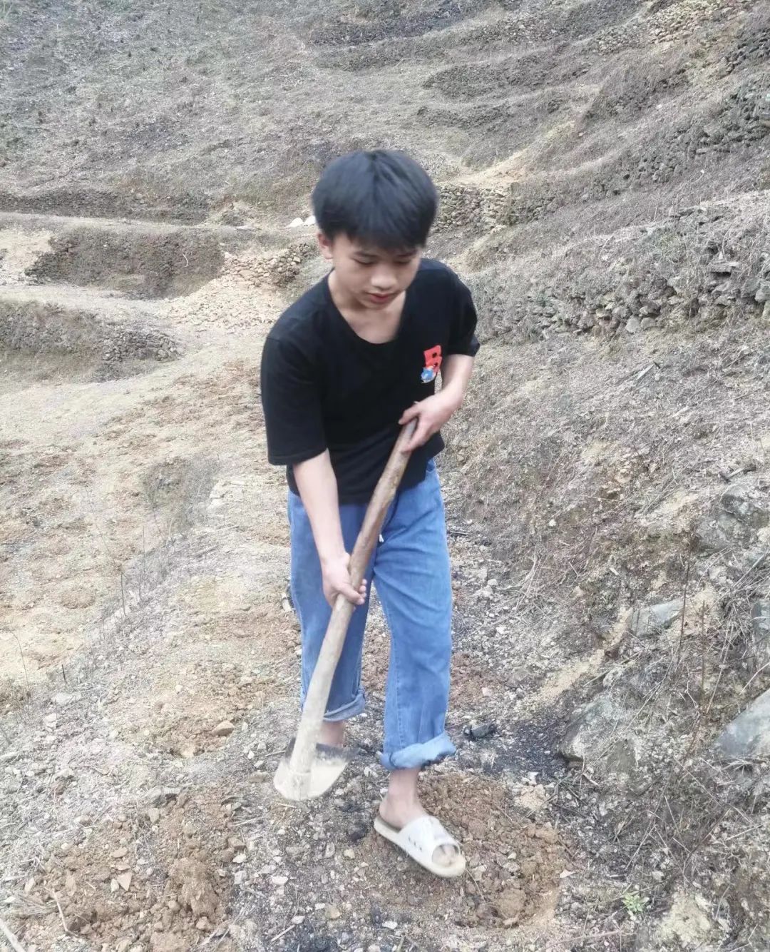 羅圓富并不在家,他此時(shí)正在山間耕作。攀過(guò)一段陡峭山坡,我們看到了圓富,他正揮舞著鋤頭,和奶奶、叔叔、嬸嬸、哥哥、堂姐一起,翻墾著貧瘠的土地,動(dòng)作熟練地讓人心疼??吹轿覀兊牡絹?lái),小家伙開(kāi)心之余也有些害羞,停下手中的活計(jì),拿出午餐筐里看著是剛砍下還很青澀的香蕉給我們吃,想必這就是孩子心中最好的食物,我急忙推托:“你們留著吃,老師香蕉過(guò)敏?!?ensp;