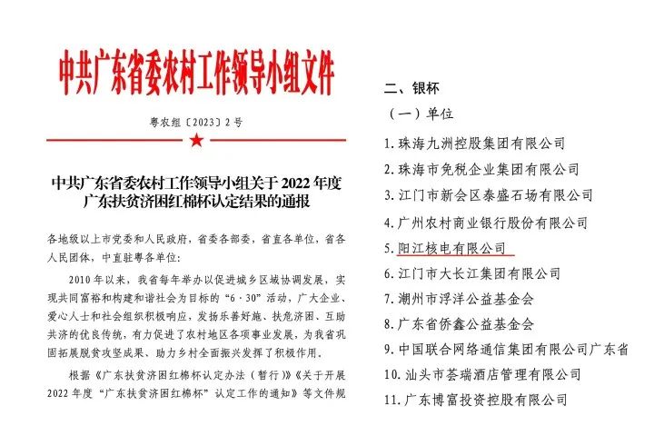6月30日,中共廣東省委農(nóng)村工作領(lǐng)導(dǎo)小組發(fā)布《關(guān)于2022 年度廣東扶貧濟(jì)困紅棉杯認(rèn)定結(jié)果的通報(bào)》,陽江核電有限公司被授予“廣東扶貧濟(jì)困紅棉杯”銀杯。