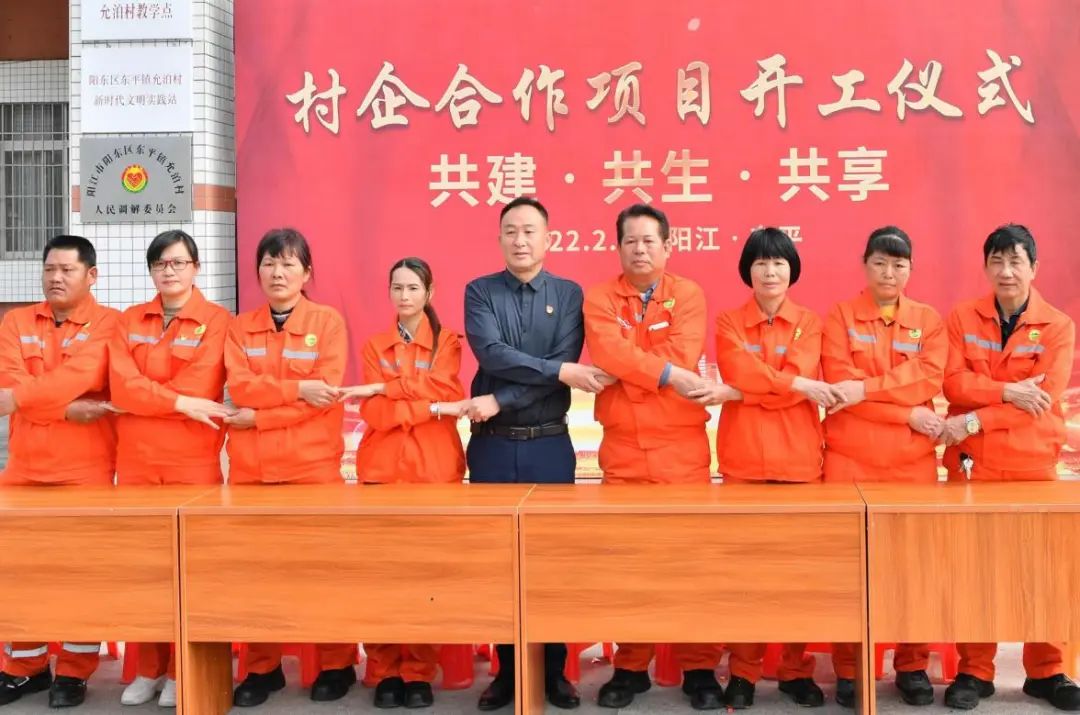 ▲陽江核電幫扶創(chuàng)辦的村集體企業(yè)“陽江允興環(huán)保工程有限公司”與員工(當(dāng)?shù)卮迕瘢┖灱s