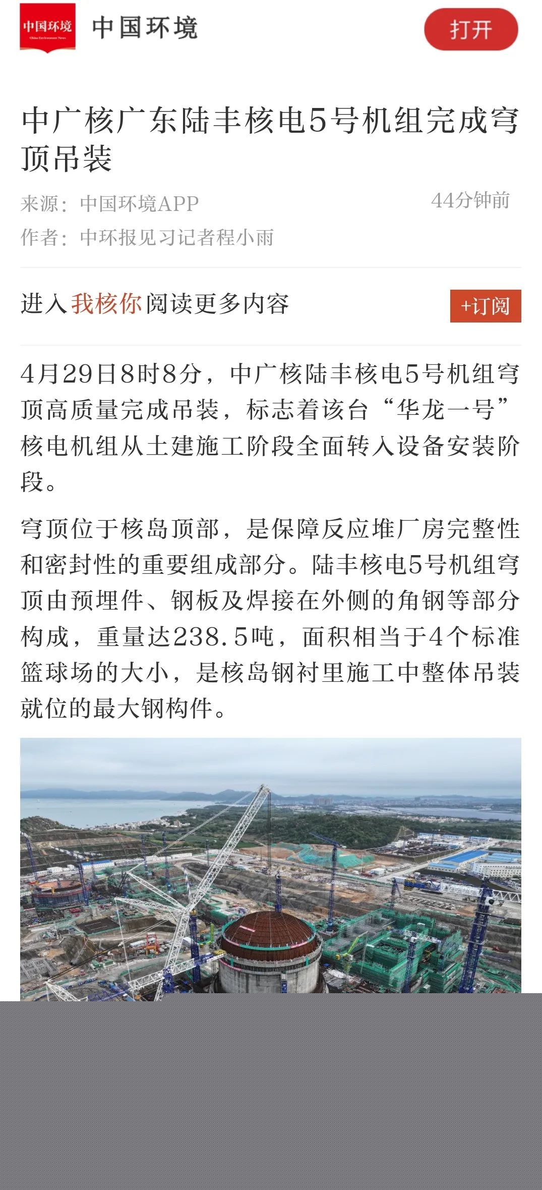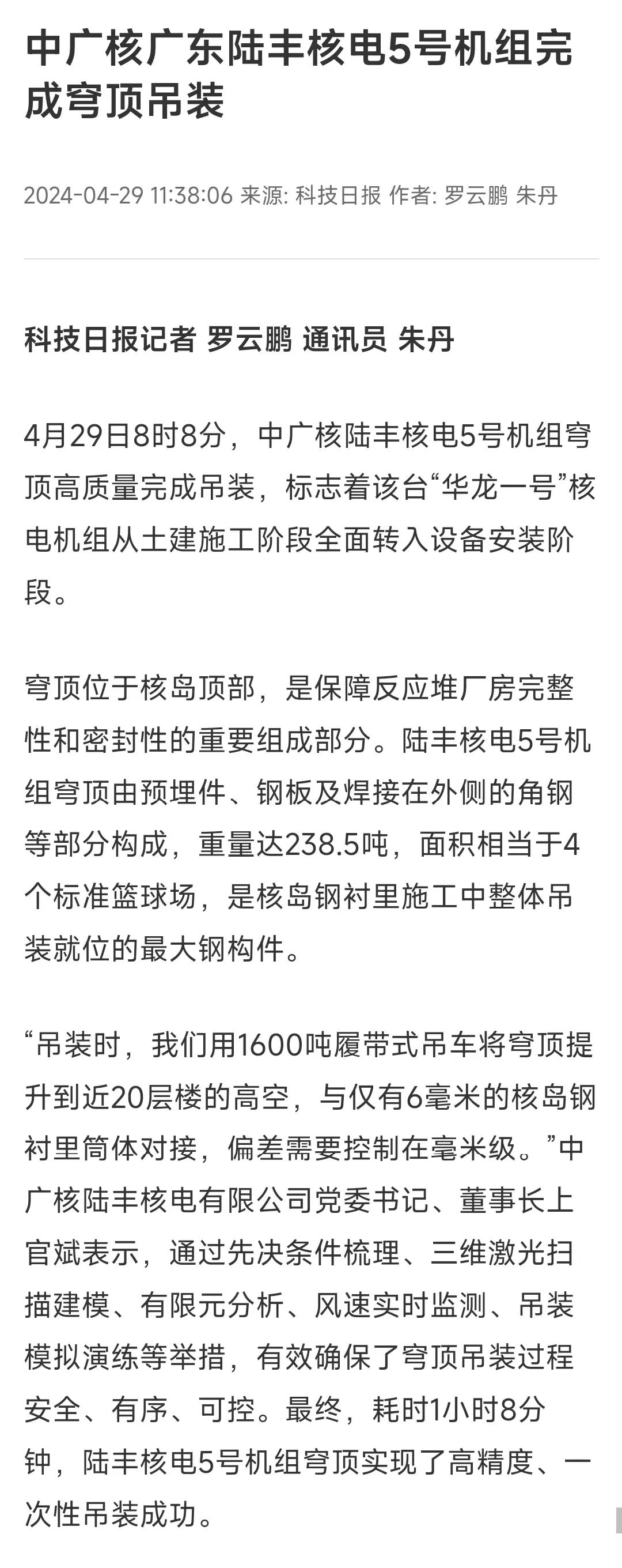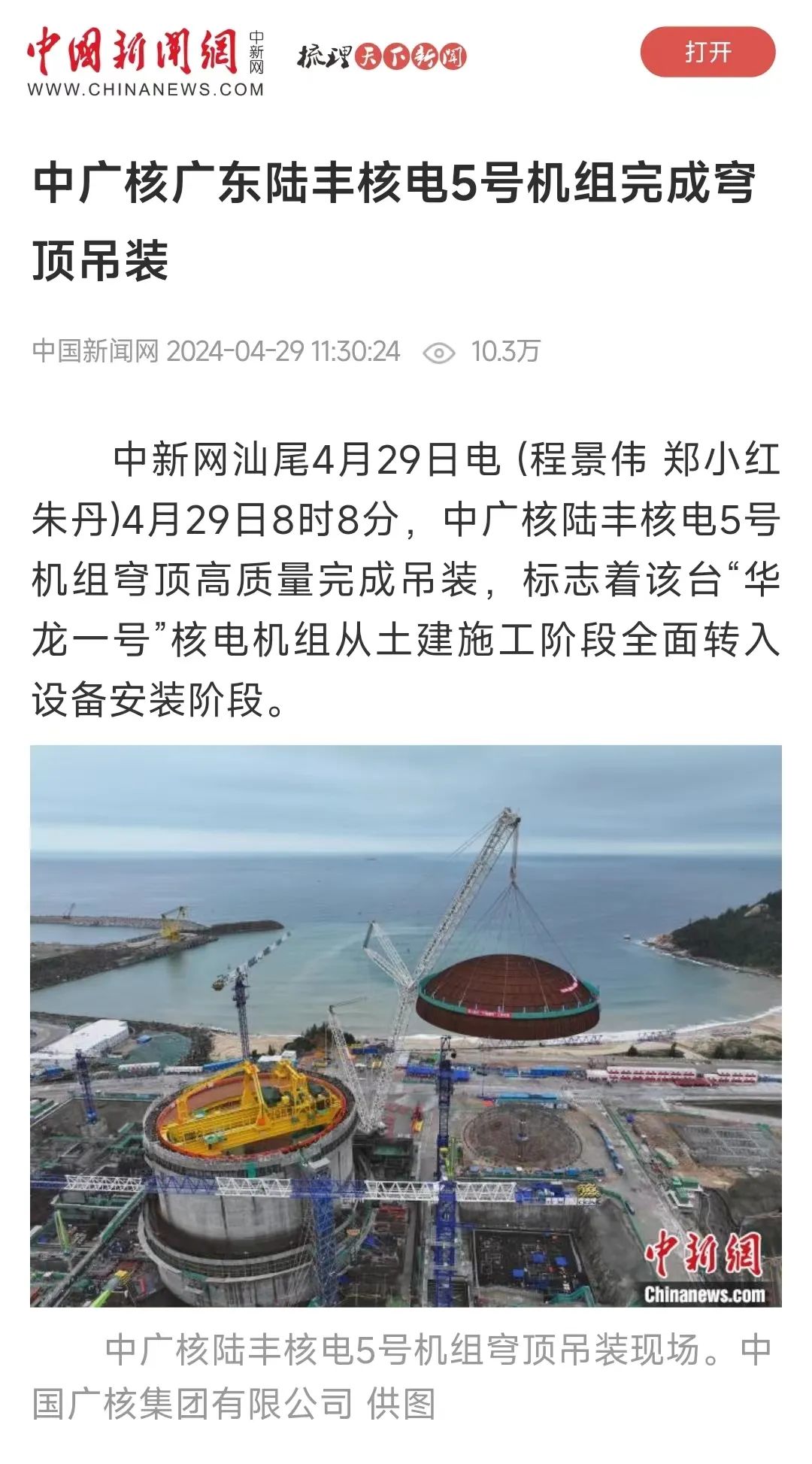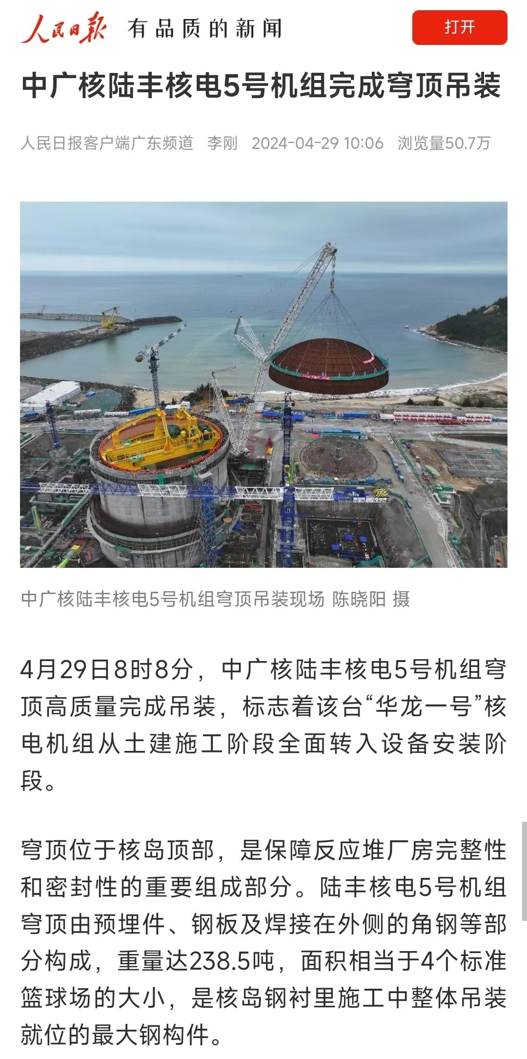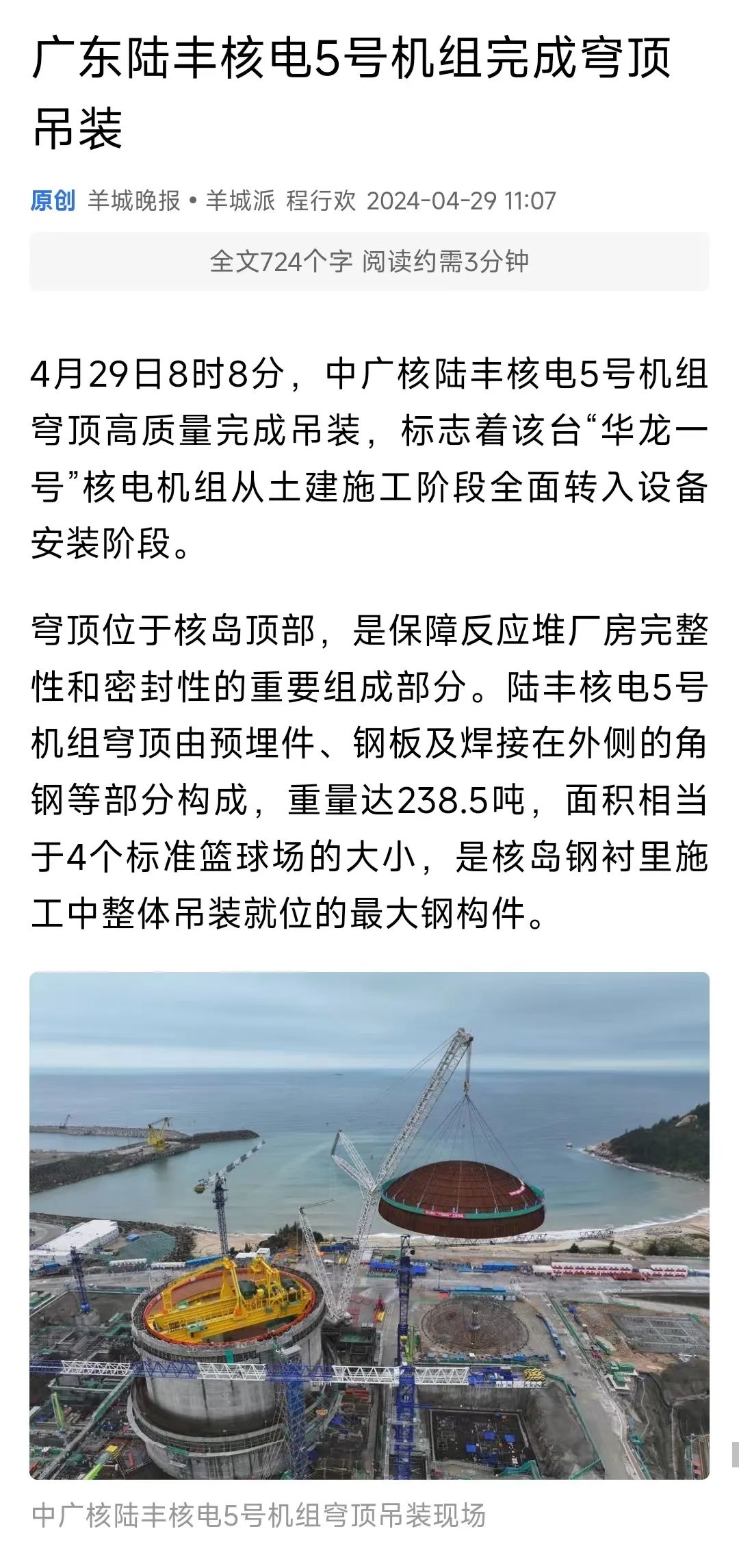 4月29日8時(shí)8分,中廣核廣東陸豐核電項(xiàng)目5號(hào)機(jī)組穹頂完成吊裝,標(biāo)志著該臺(tái)“華龍一號(hào)”核電機(jī)組從土建施工階段全面轉(zhuǎn)入設(shè)備安裝階段。人民日?qǐng)?bào)、新華社、央視等多家主流媒體對(duì)此進(jìn)行聚焦報(bào)道。