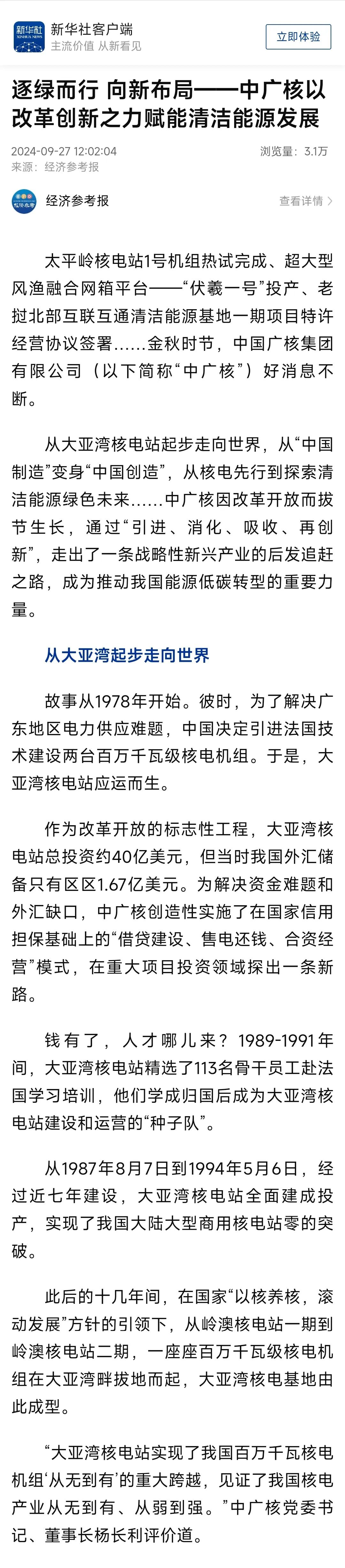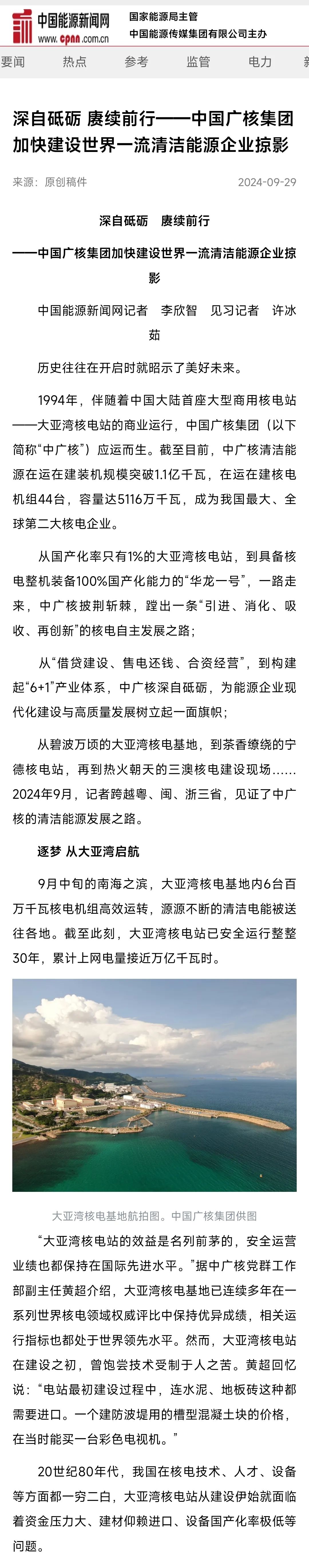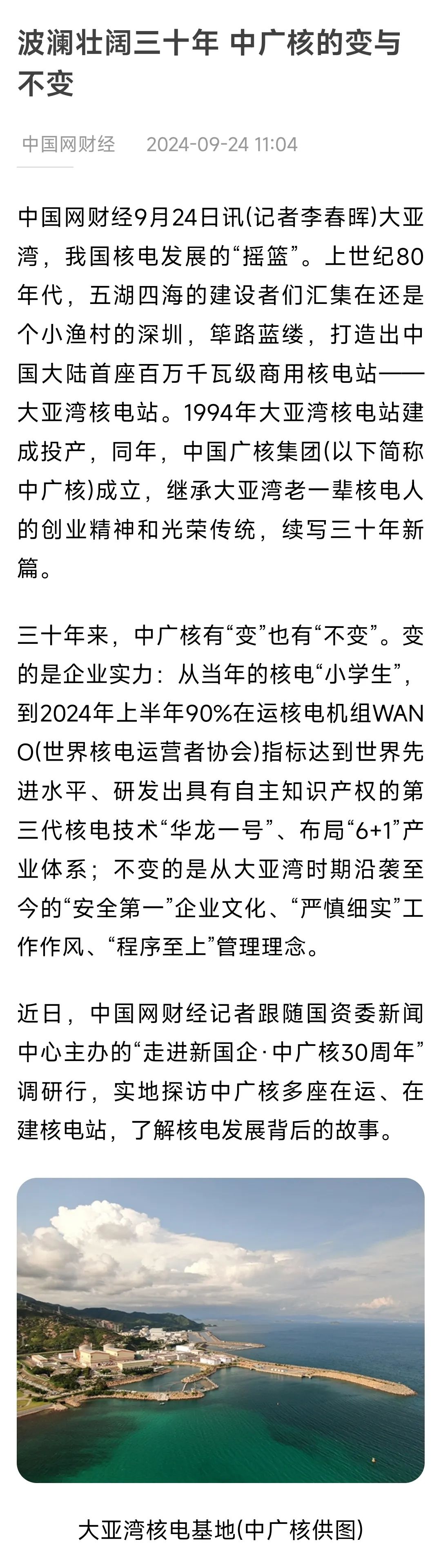 聚焦報(bào)道了中廣核從大亞灣核電站起步